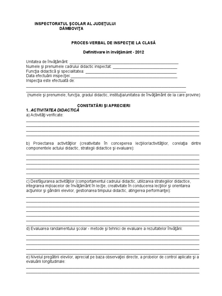 Model Proces Verbal De Inspectie La Clasa Definitivat 2012