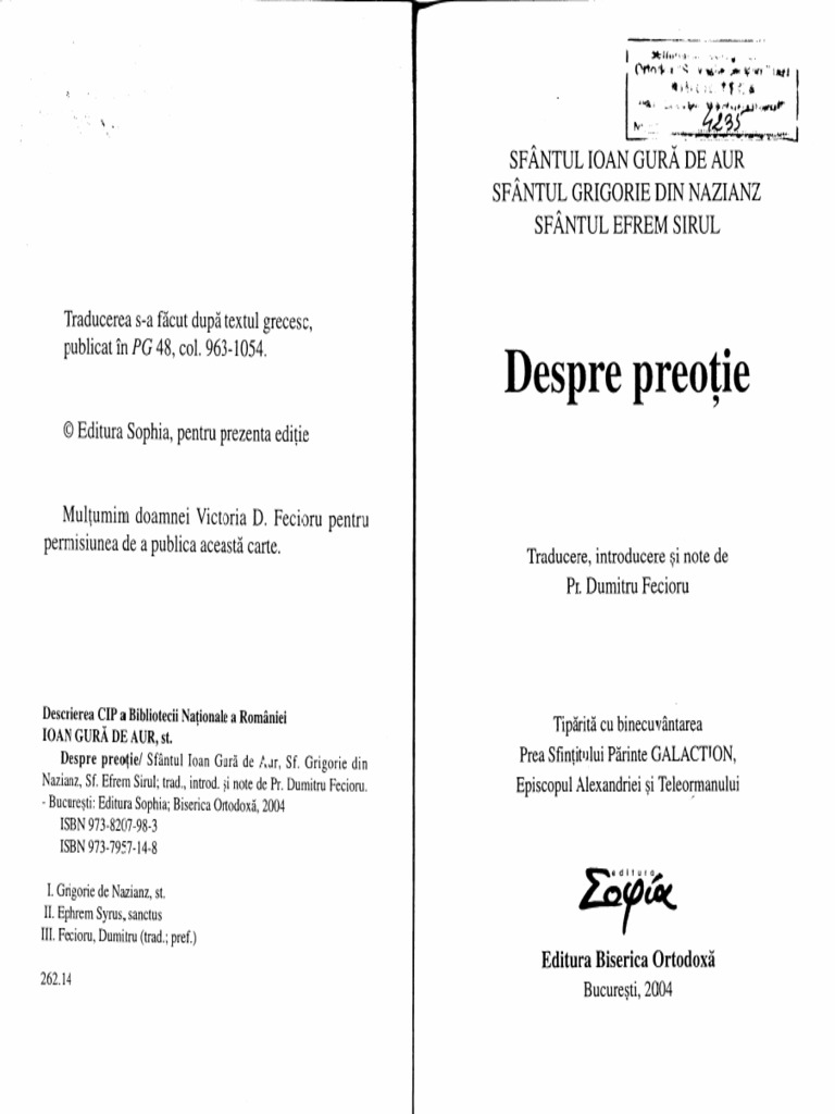 Despre Preotie Sfantul Grigorie De Nazianz Sfantul Efrem Sirul Sfantul Ioan Gura De Aur
