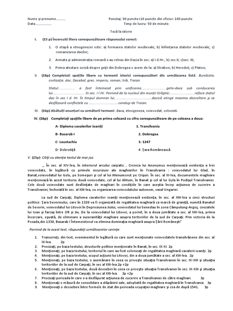 Suibiect Istoria Romanilor Semestrul I Clasa A Viii A 2008